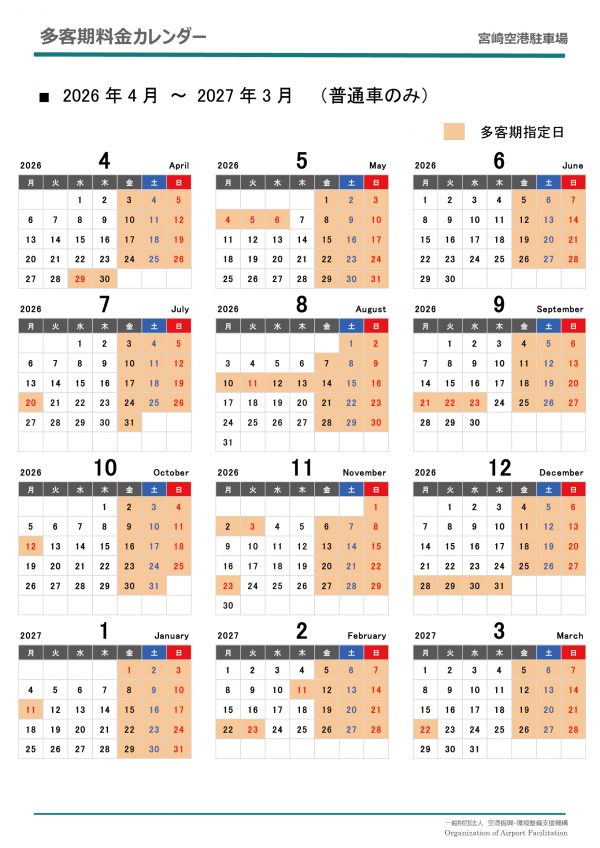 宮崎空港駐車場を運営する「空港支援機構(正式名:一般財団法人 空港振興・環境整備支援機構)」より、2026年4月1日以降の駐車料金改定のお知らせです。
