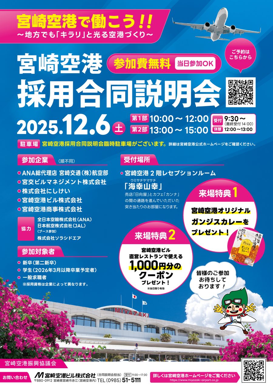 宮崎空港採用合同説明会予約フォームにてご予約を受け付けております。※ご予約なしでもご参加いただけます。
