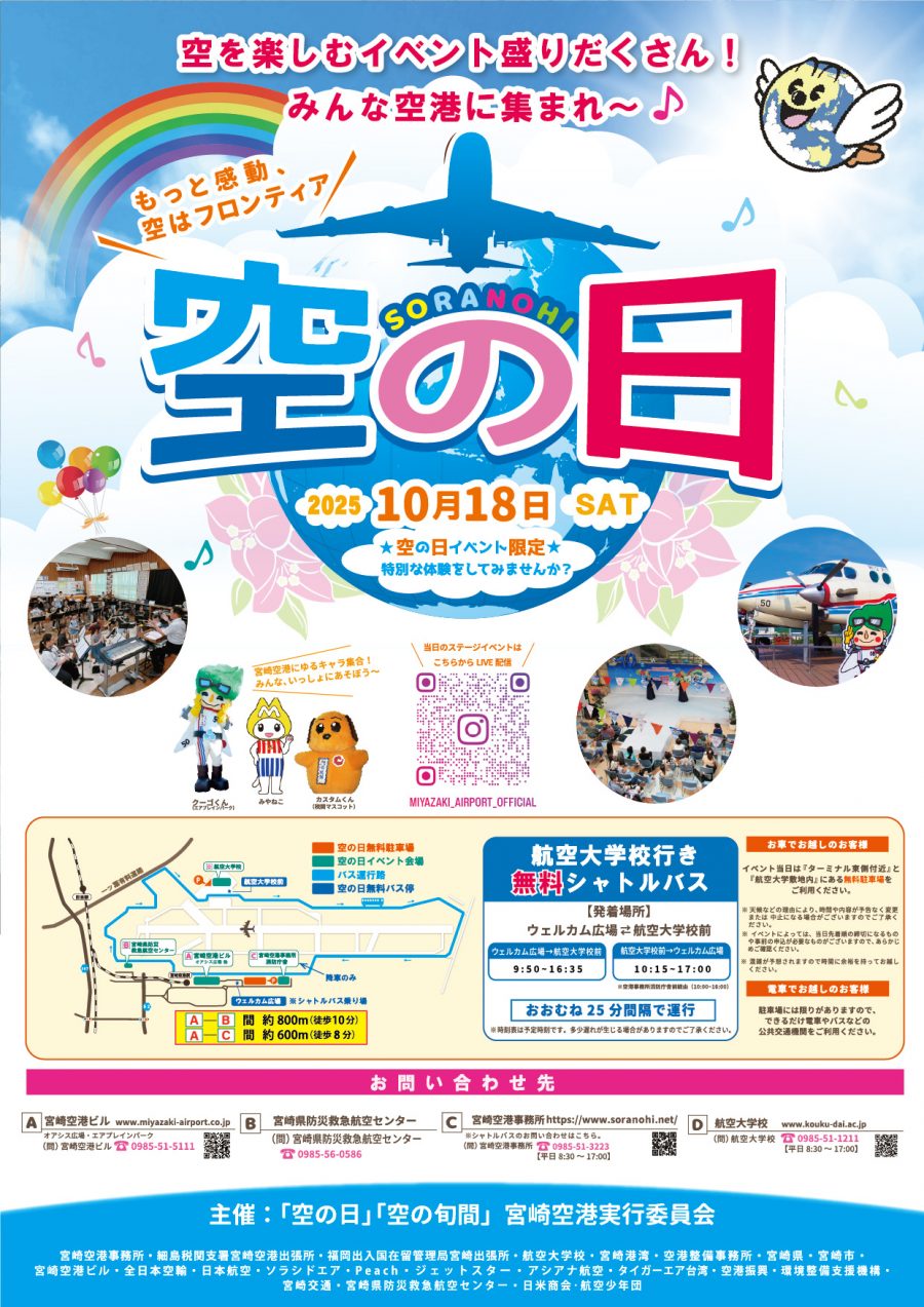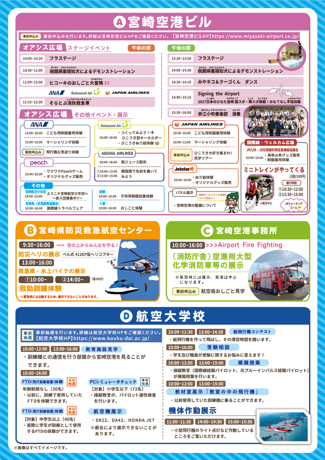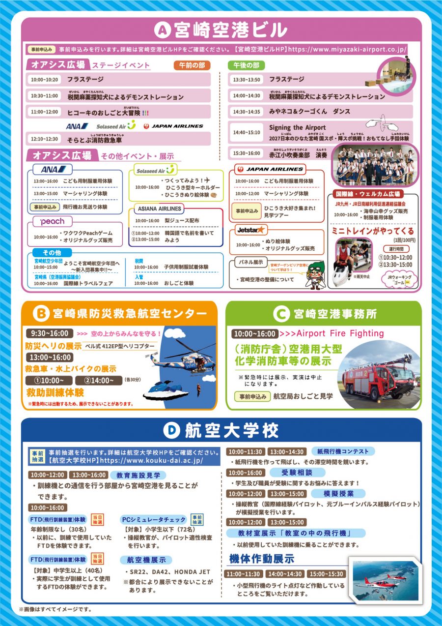 | 備考 | 主催:「空の日」「空の旬間」宮崎空港実行委員会 (宮崎空港事務所・細島税関支署宮崎空港出張所・福岡出入国在留管理局宮崎出張所・航空大学校・宮崎港湾空港整備事務所・宮崎県・宮崎市・宮崎空港ビル・全日本空輸・日本航空・ソラシドエア・Peach・ジェットスター・アシアナ航空・タイガーエア台湾・空港振興・環境整備支援機構・宮崎交通・宮崎県防災救急航空センター・日米商会・航空少年団) |